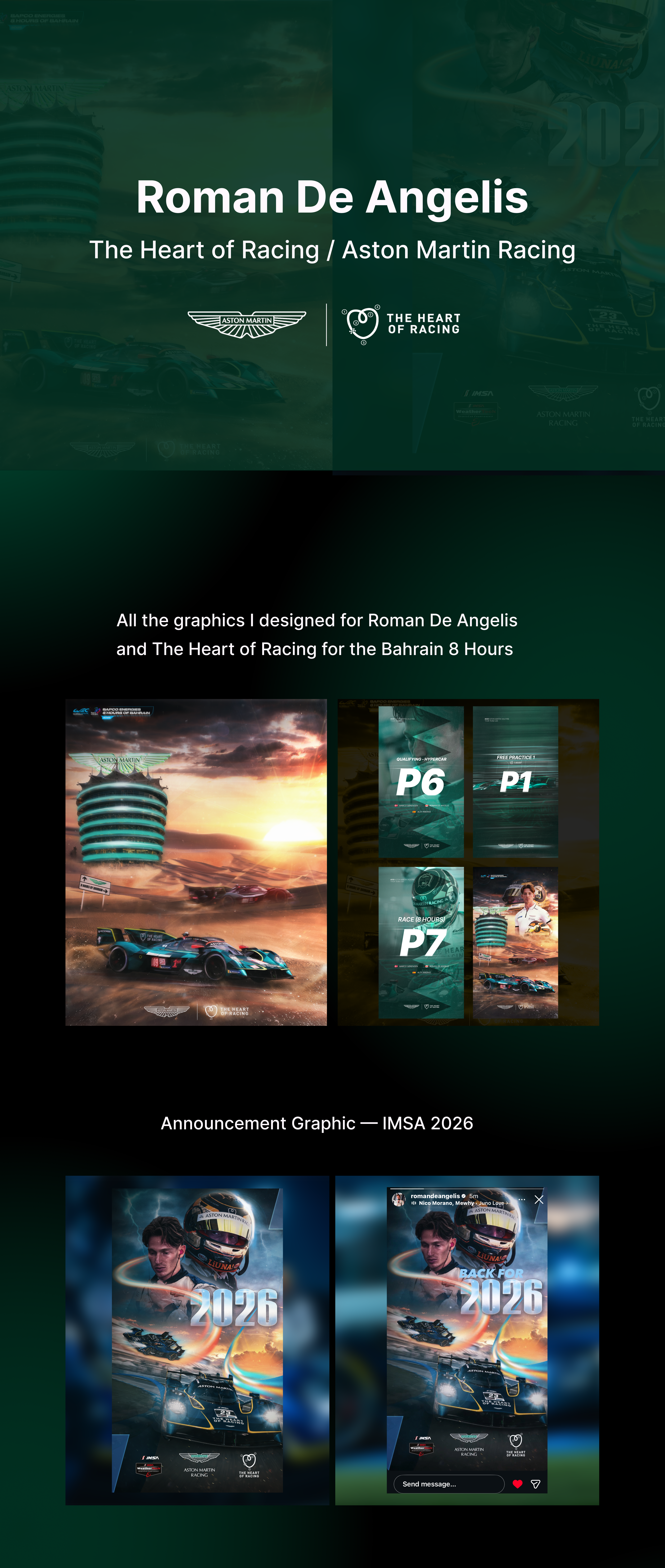 A collection of official announcement graphics created for Roman De Angelis and The Heart of Racing, representing Aston Martin Racing, for the Bahrain 8 Hours — IMSA 2026. This project focuses on delivering bold, race-driven visuals that reflect the prestige of endurance racing while maintaining brand consistency across all assets. Each graphic was designed to capture the intensity, anticipation, and professionalism of an international motorsport announcement.
